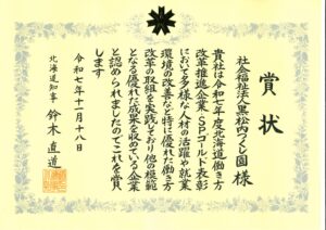 令和7年11月18日、北海道知事より「令和7年度北海道働き方 改革推進企業・SPゴールド表彰」を受賞