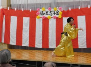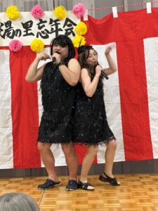 今年はなんと!!大物演歌歌手 “北島六三郎”が…出演予定でしたが、インフルエンザに感染してしまい急遽、弟の“北島十三郎”に出演していただきました。他にも昭和のスーパーアイドル “ももいろレディ”や施設の利用者様と職員で“花笠音頭”を披露していただきました。